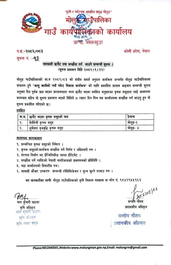 लाभग्राही छनौैट तथा सम्झौता गर्न आउने सम्बन्धी सूचना