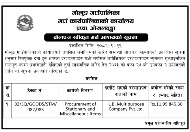 बोलपत्र स्वीकृत गर्ने आशयको सूचना