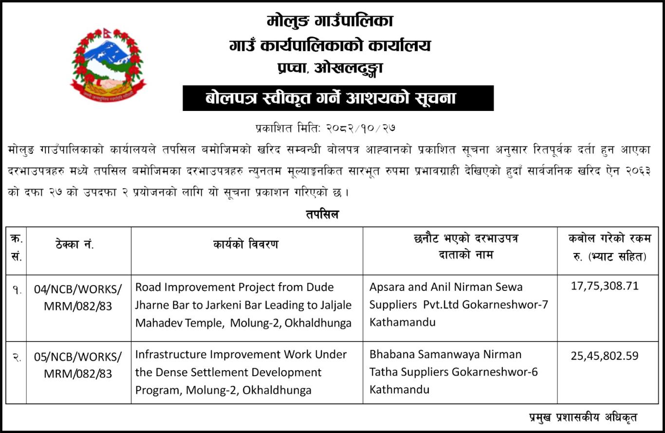 बोलपत्र स्वीकृत गर्ने आशयको सूचना !