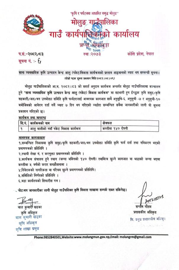 साना व्यवसायिक कृषि उत्पादन केन्द्र आलु (पकेट) विकास कार्यक्रमको म्याद थप सम्बन्धी सूचना ।